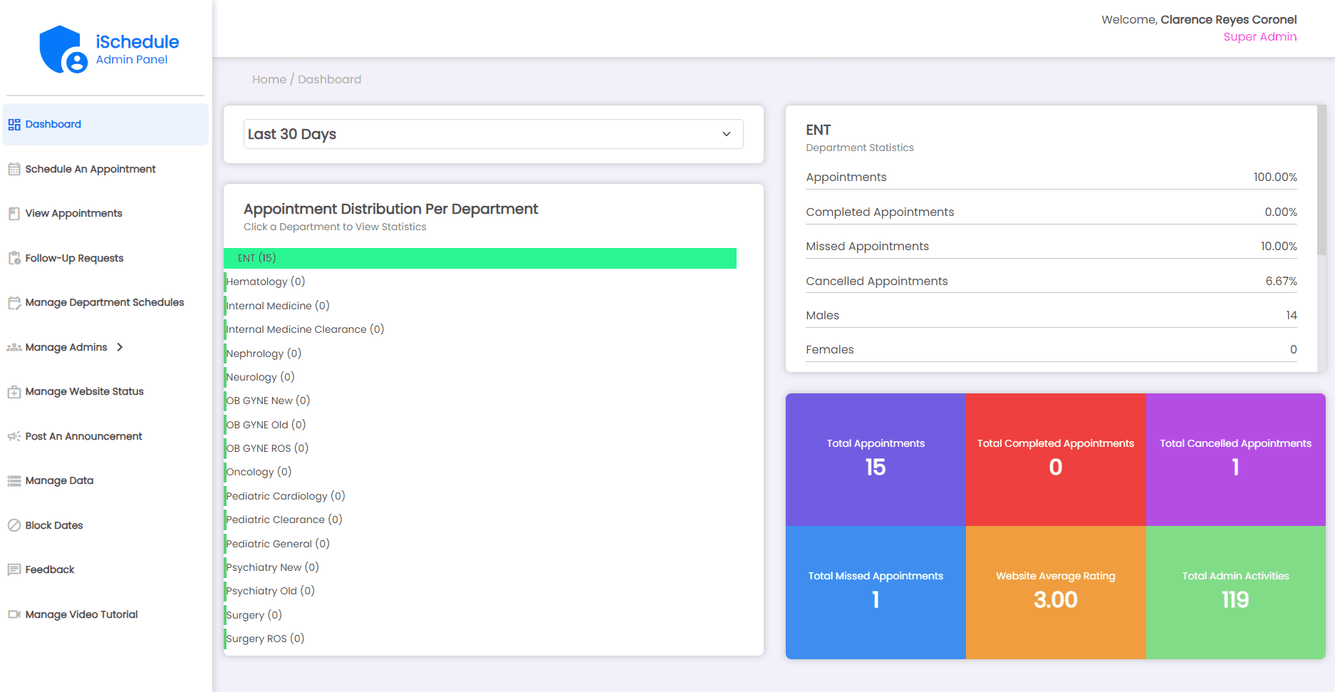 An admin dashboard for the iSchedule app, an outpatient appointment scheduling web application. This dashboard allows administrators to manage user data, patient schedules, and more. It features tools...